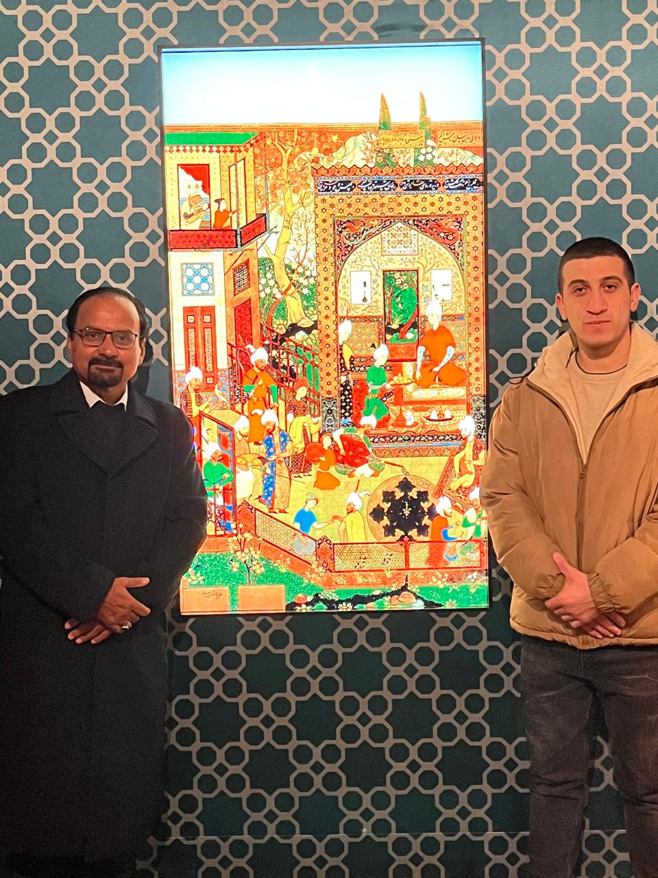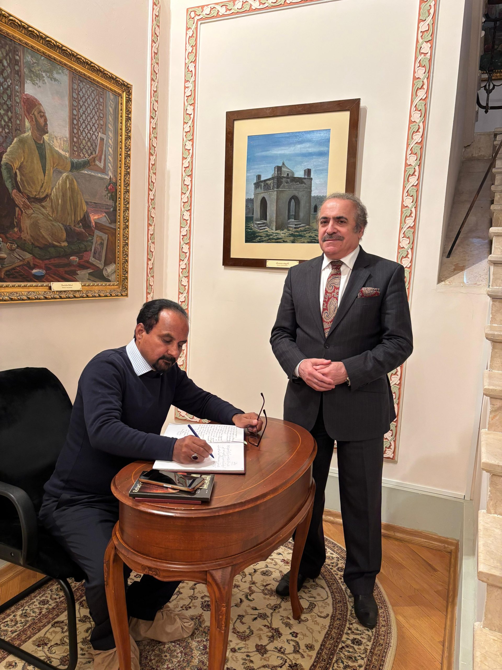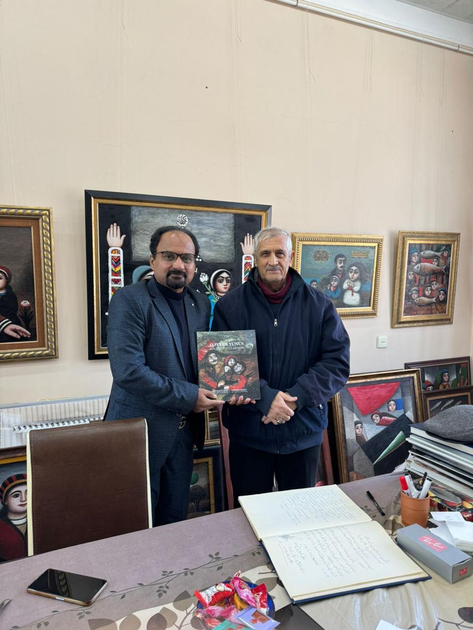 Professor Qızılbaş heyranlıqla Qəyyur Yunusun rəsm əsərlərinə, xüsusilə də, dini-fəlsəfi əsərlərinə tamaşa edərək, Qəyyur müəllim ilə əsərlərin fəlsəfi mənaları haqqında xoş söhbət edirdilər. Professor Qızılbaş, Qəyyur müəllimə 🇵🇰 Bəlucistan bölgəsinin ənənəvi kişi geyimi “Bəluc şalını” hədiyyə etdi. Qəyyur müəllimdə öz rəsm əsərlərinin əks olduğu “Həqiqət Yollarında” kitabını imzalı şəkildə Professora hədiyyə etdi.